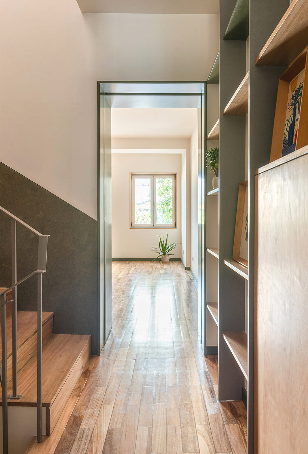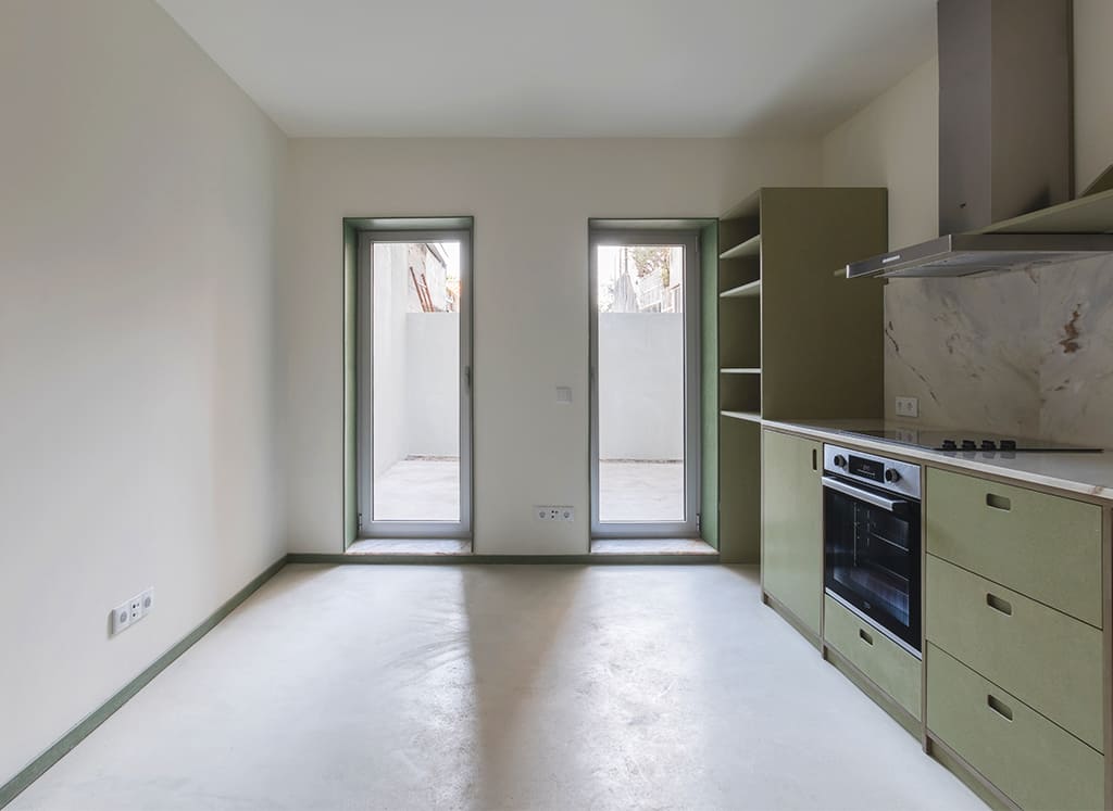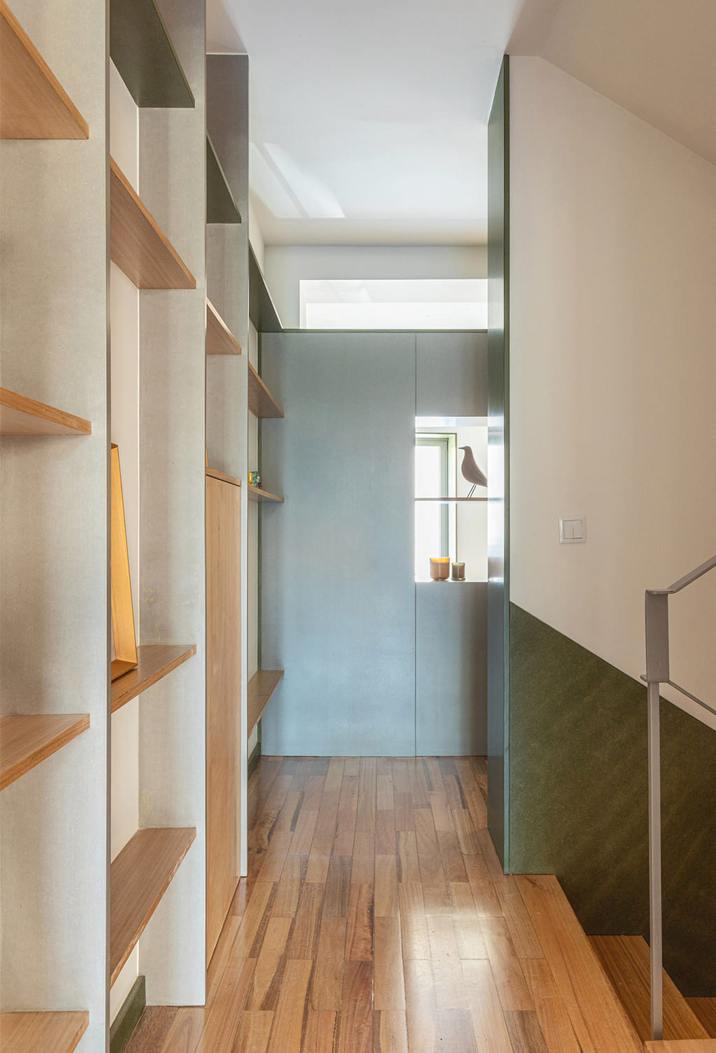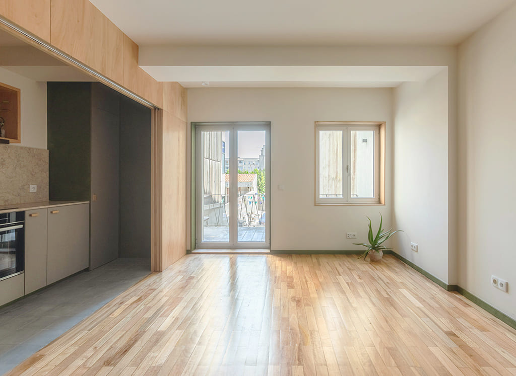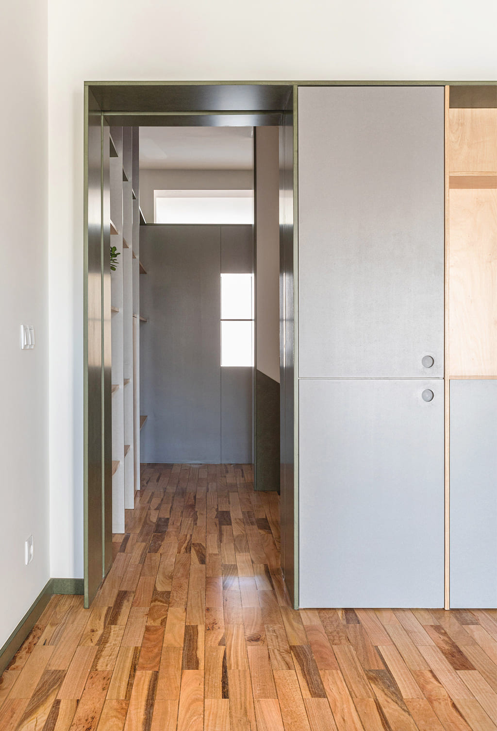 De um prédio vazio de seis pequenos apartamentos, ampliaram-se os espaços e reduziram-se as famílias para duas. Com a proporção da obra de reabilitação e a necessidade de controle de custos, a premissa que deu a cara ao projeto foi a escolha de materiais no seu estado puro. Materiais sem pinturas, nem máscaras, onde as cores e texturas se destacam, em linhas continuas que interligam os espaços, harmoniosamente, dando também lugar à intimidade e resguardo do habitar.