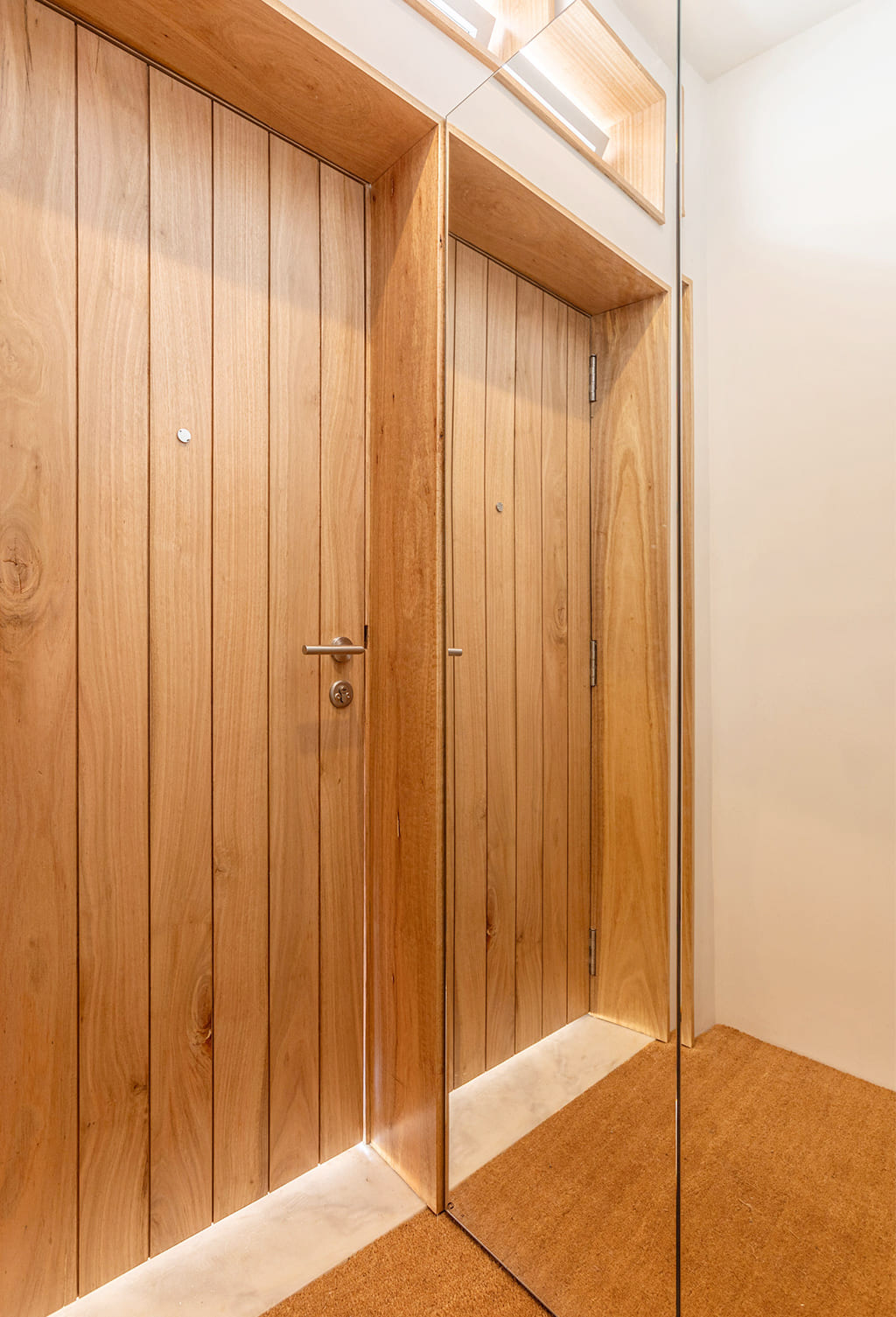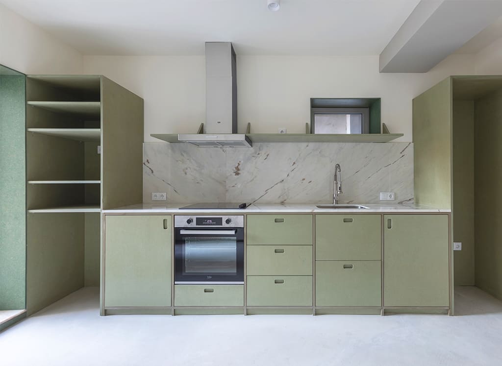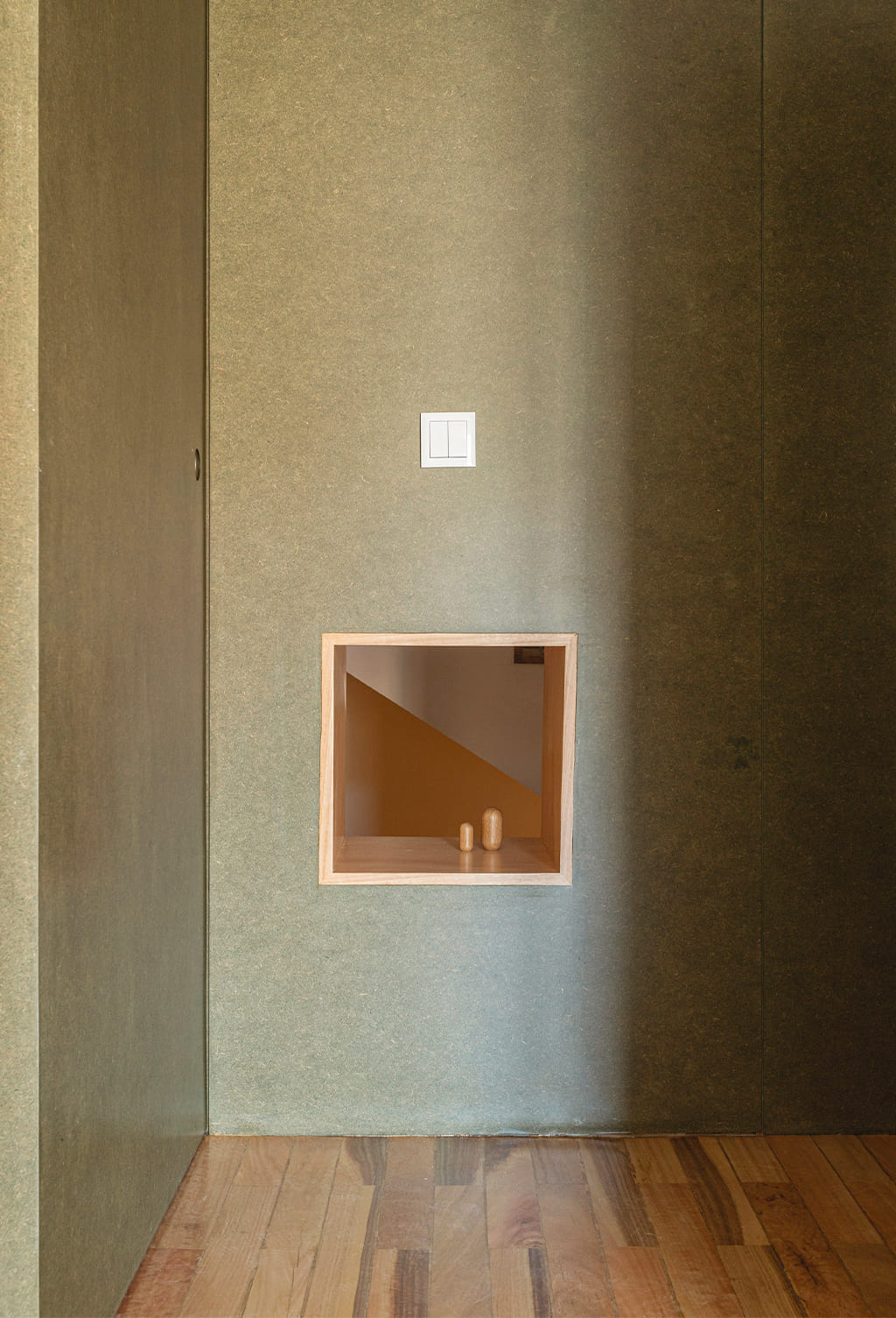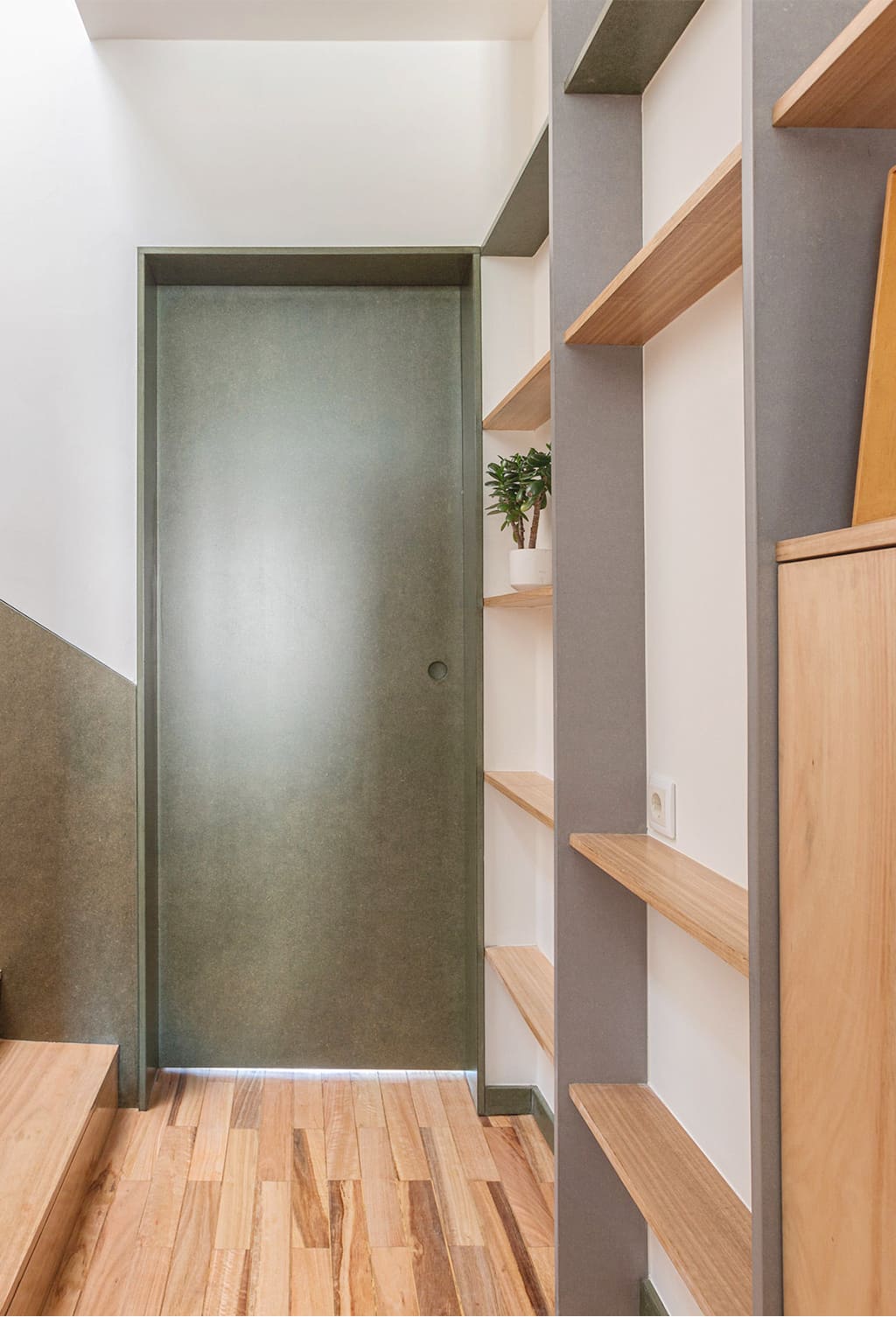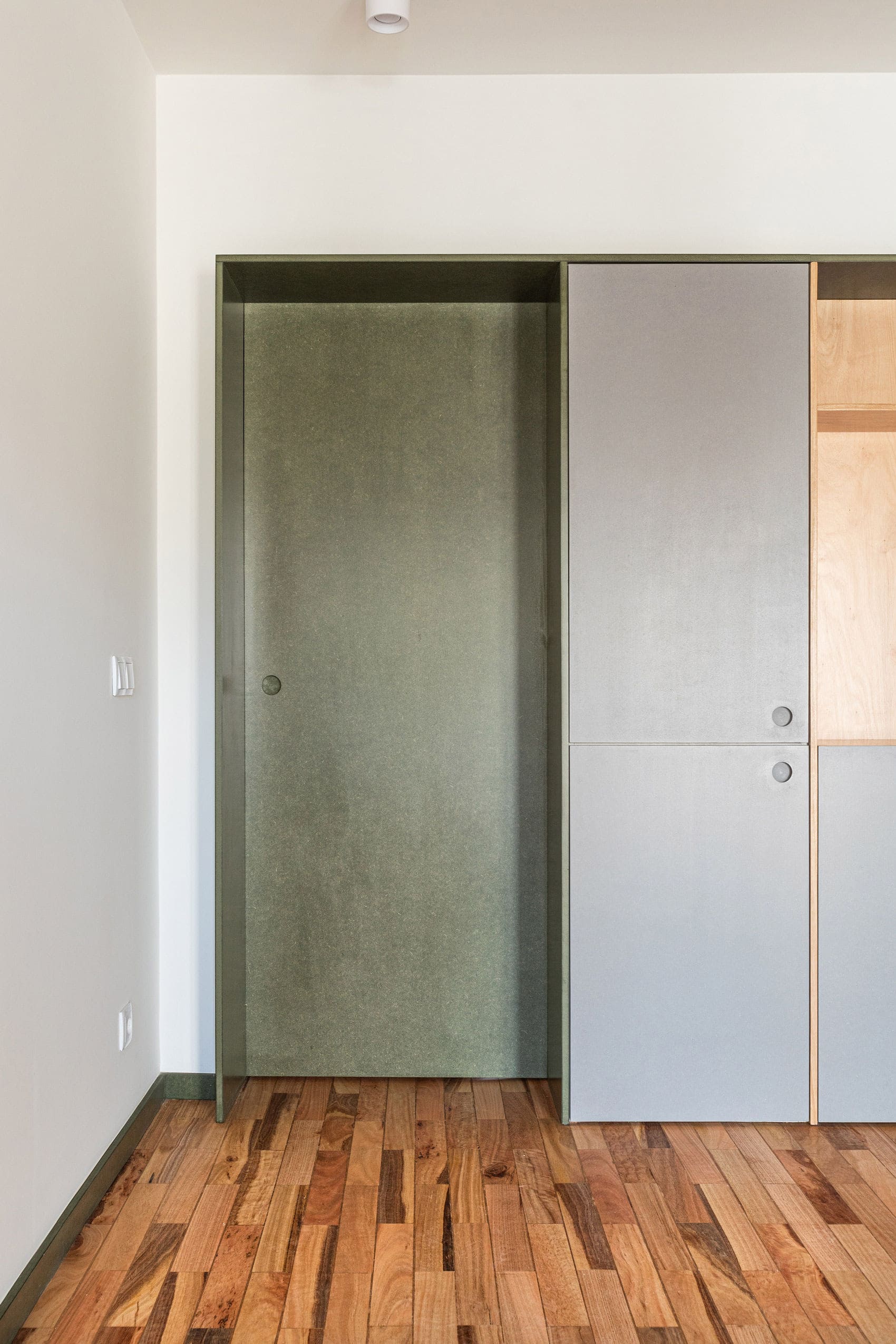 De um prédio vazio de seis pequenos apartamentos, ampliaram-se os espaços e reduziram-se as famílias para duas. Com a proporção da obra de reabilitação e a necessidade de controle de custos, a premissa que deu a cara ao projeto foi a escolha de materiais no seu estado puro. Materiais sem pinturas, nem máscaras, onde as cores e texturas se destacam, em linhas continuas que interligam os espaços, harmoniosamente, dando também lugar à intimidade e resguardo do habitar.