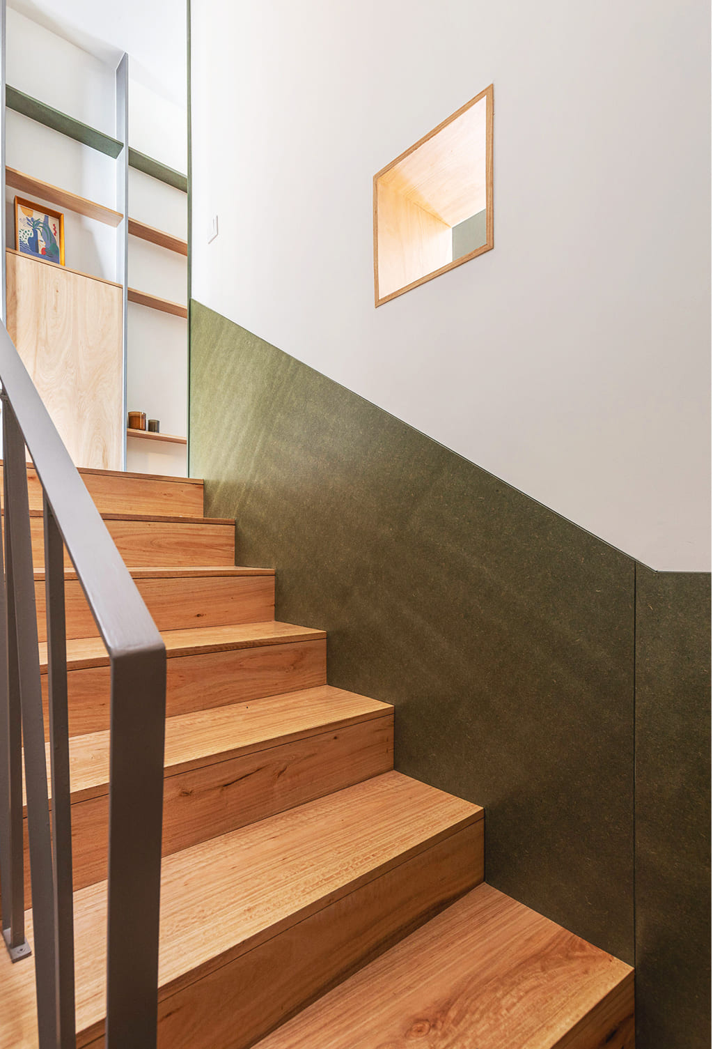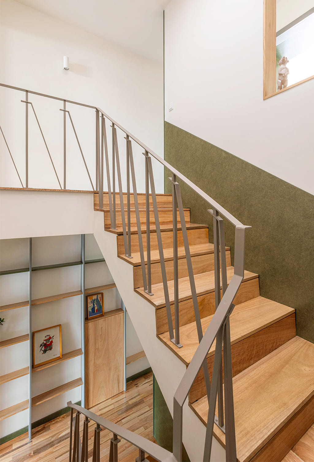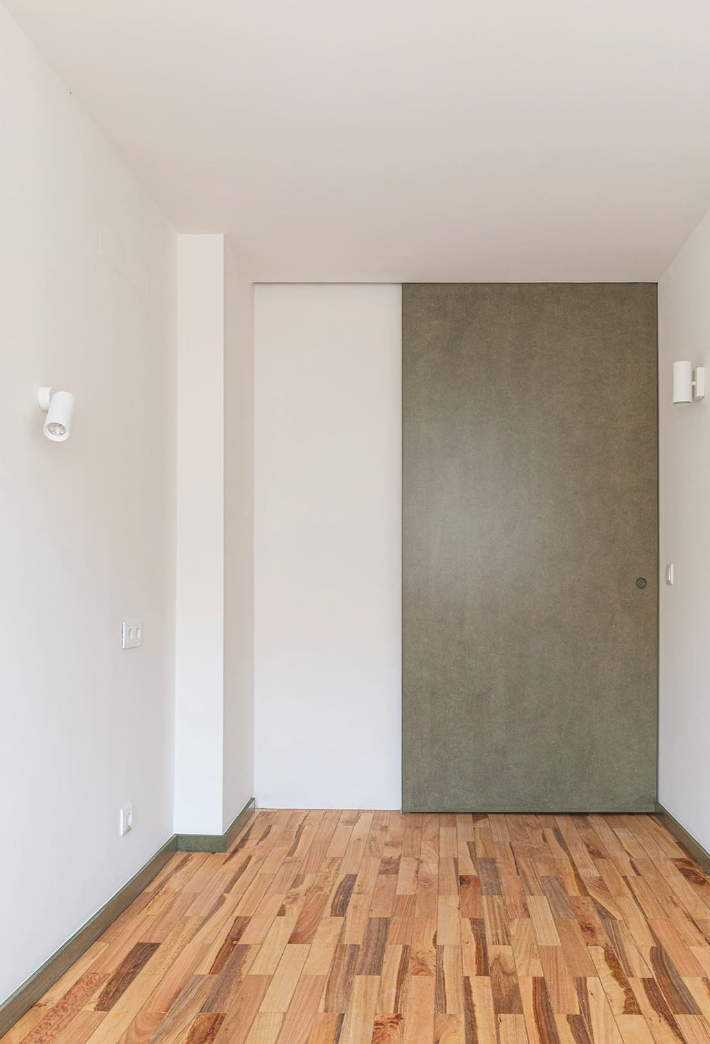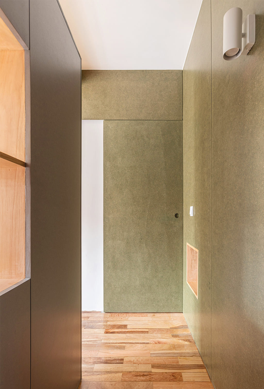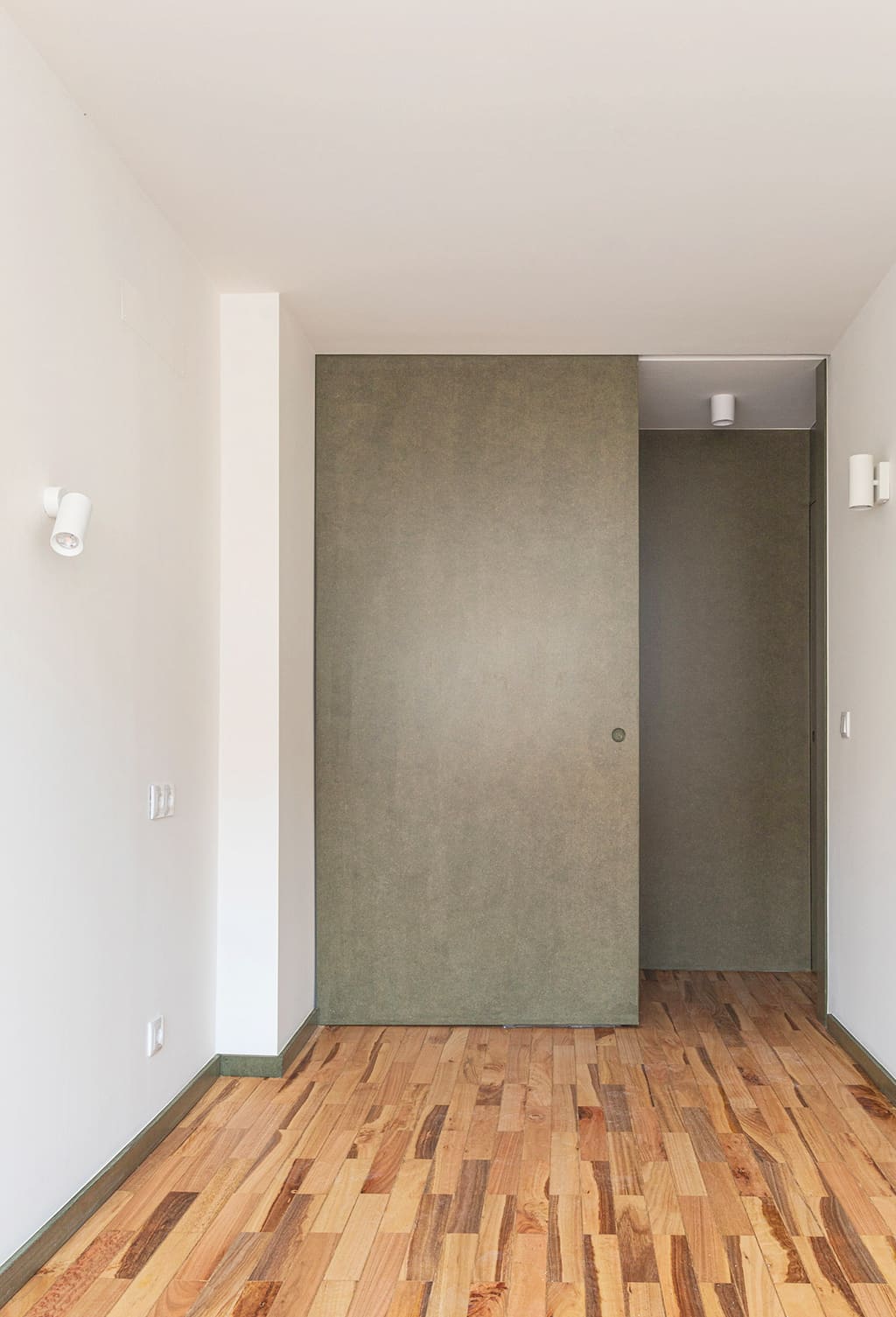 De um prédio vazio de seis pequenos apartamentos, ampliaram-se os espaços e reduziram-se as famílias para duas. Com a proporção da obra de reabilitação e a necessidade de controle de custos, a premissa que deu a cara ao projeto foi a escolha de materiais no seu estado puro. Materiais sem pinturas, nem máscaras, onde as cores e texturas se destacam, em linhas continuas que interligam os espaços, harmoniosamente, dando também lugar à intimidade e resguardo do habitar.