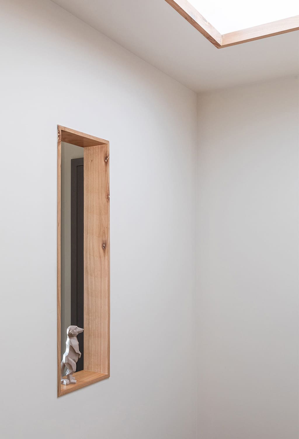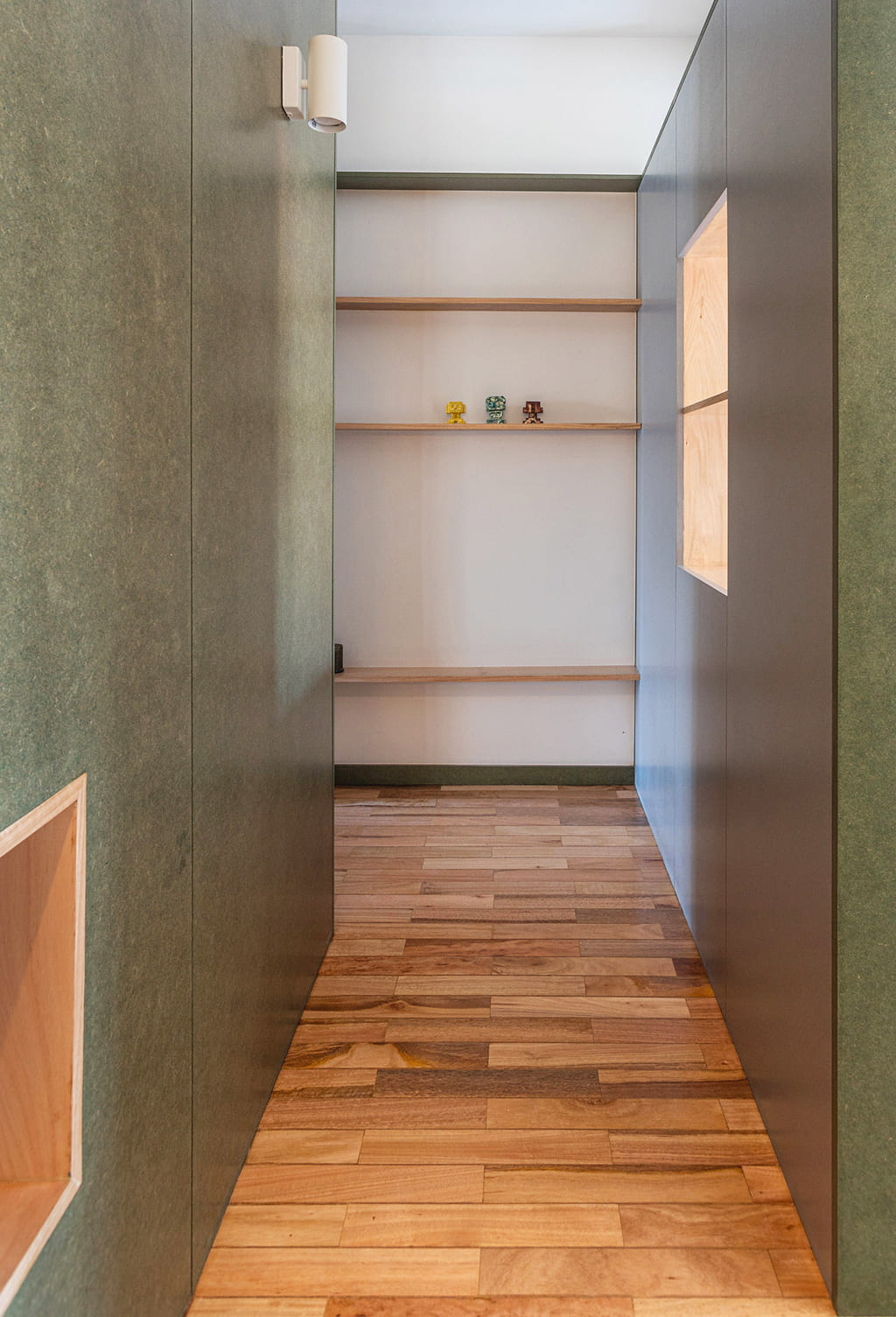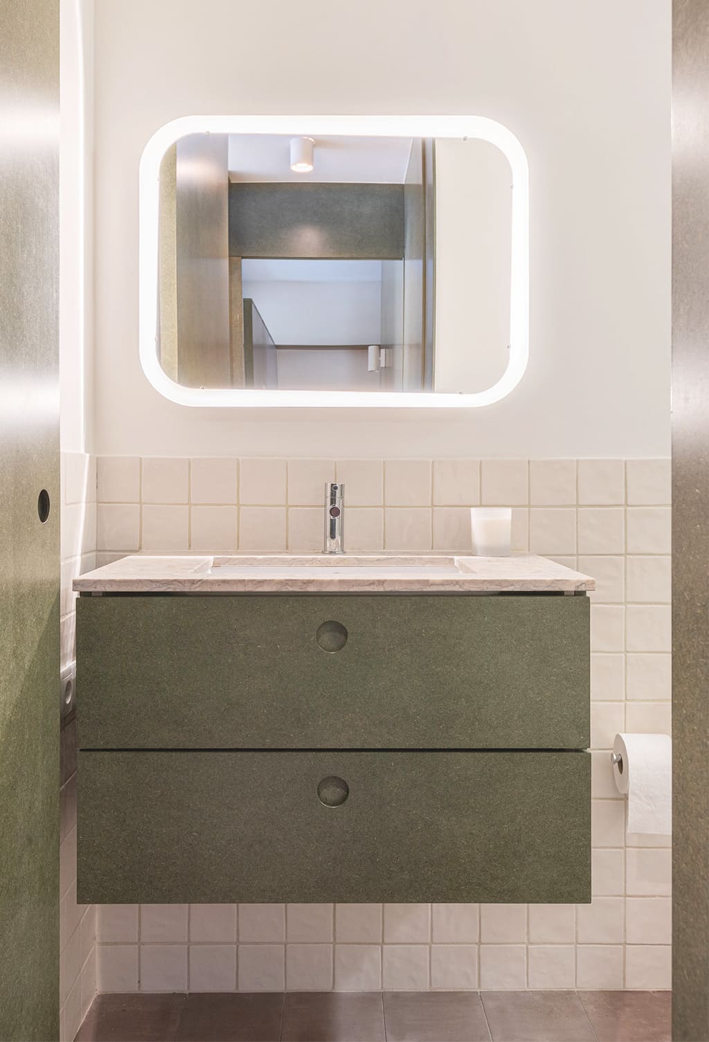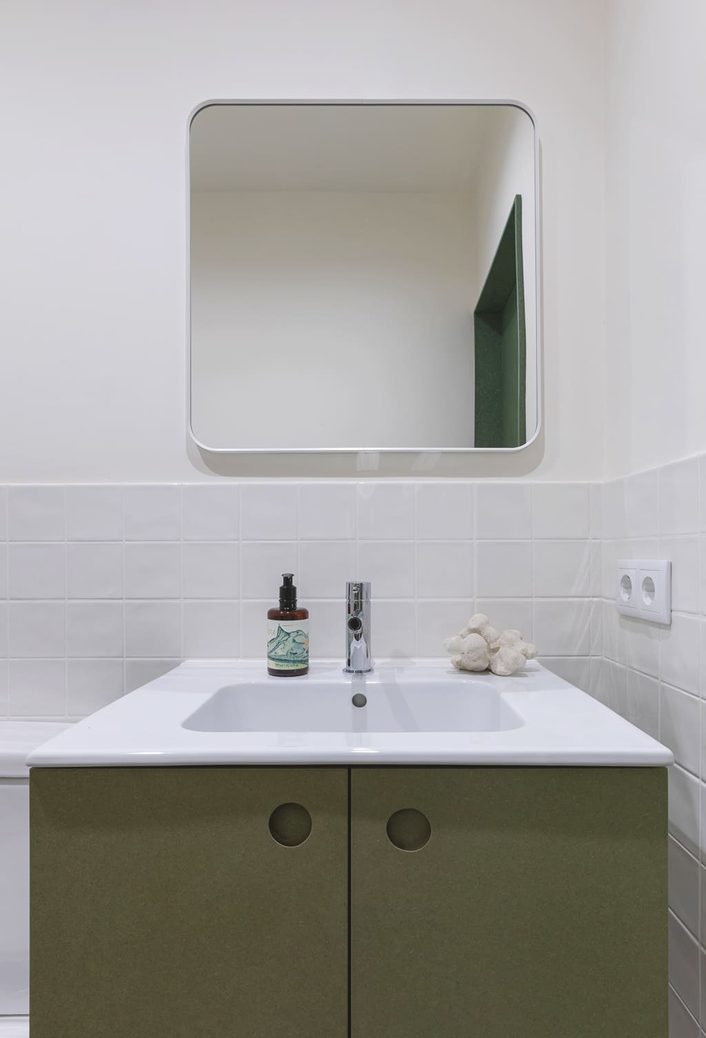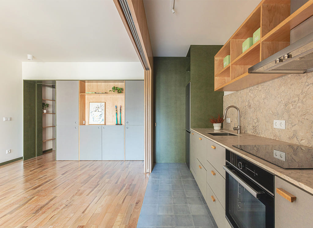 De um prédio vazio de seis pequenos apartamentos, ampliaram-se os espaços e reduziram-se as famílias para duas. Com a proporção da obra de reabilitação e a necessidade de controle de custos, a premissa que deu a cara ao projeto foi a escolha de materiais no seu estado puro. Materiais sem pinturas, nem máscaras, onde as cores e texturas se destacam, em linhas continuas que interligam os espaços, harmoniosamente, dando também lugar à intimidade e resguardo do habitar.