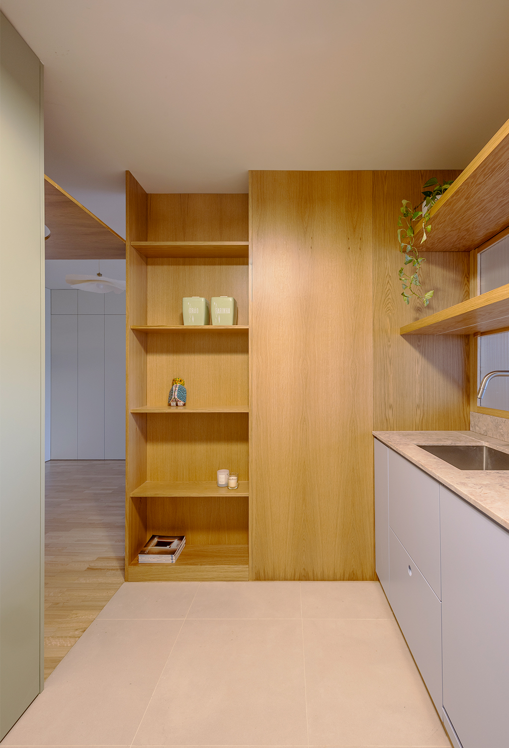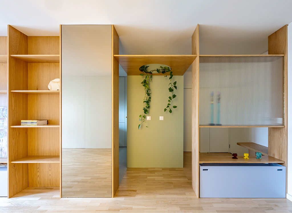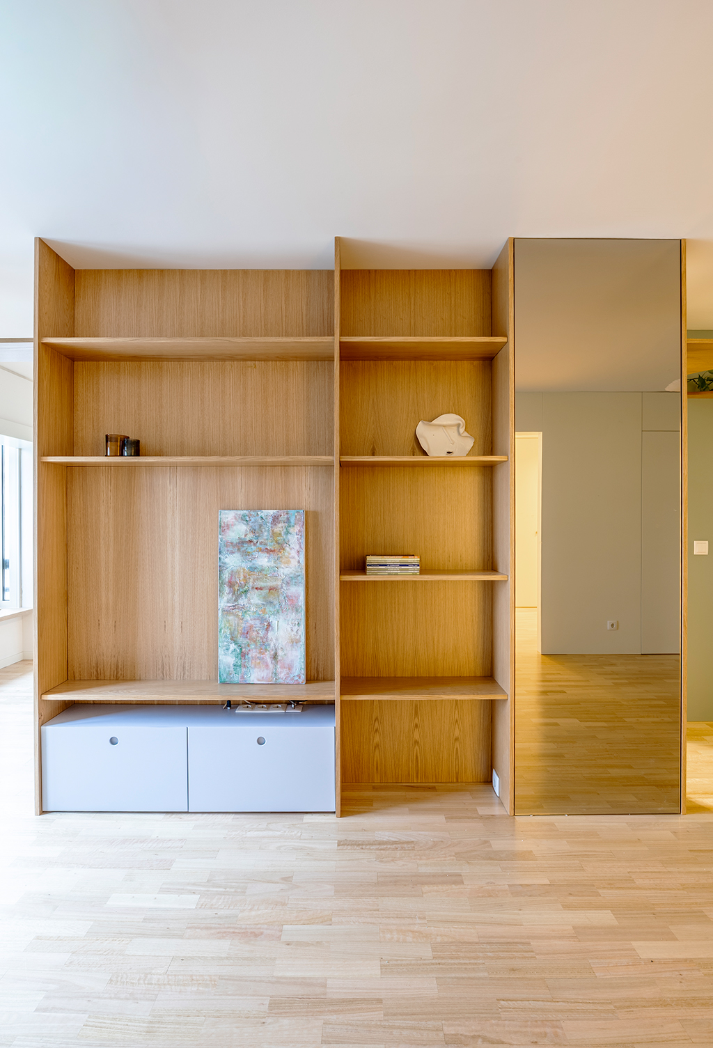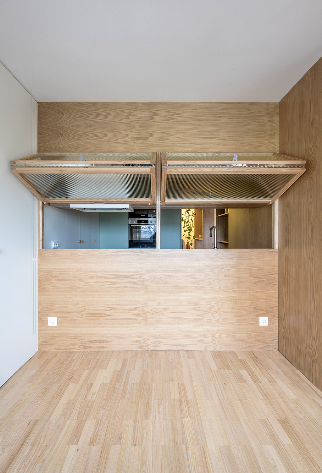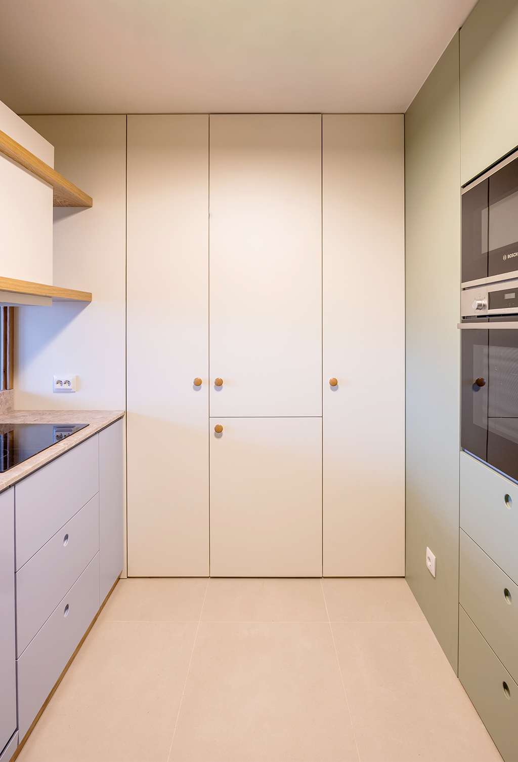 Um pequeno apartamento com flexibilidade de espaços e aproveitamento detalhado, com carpintarias de carvalho e tons pastel, que enchem a alma.