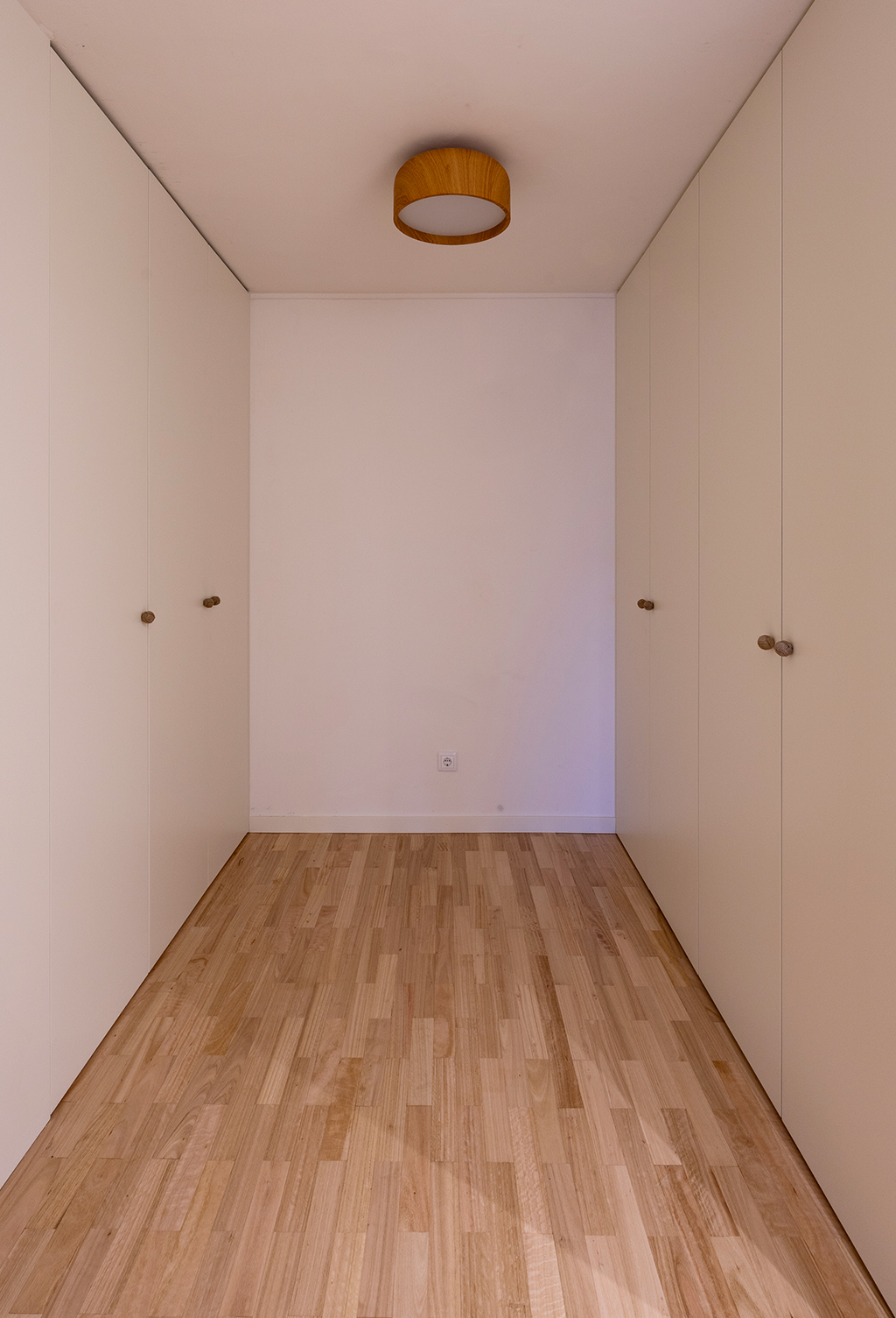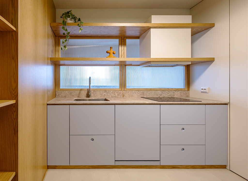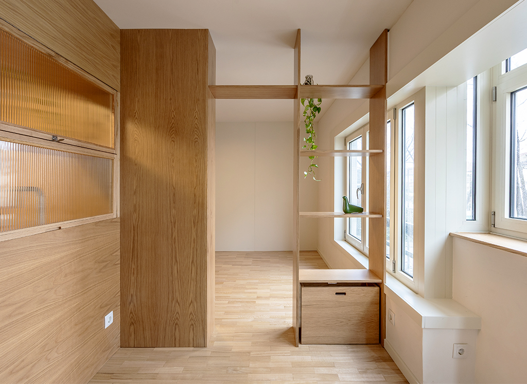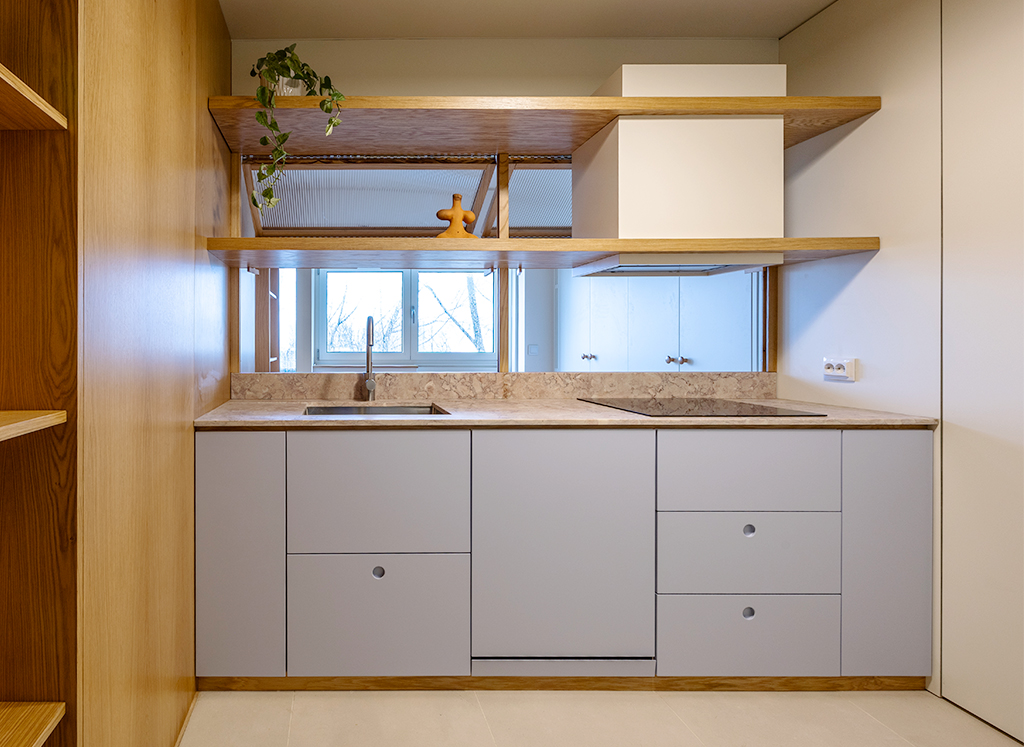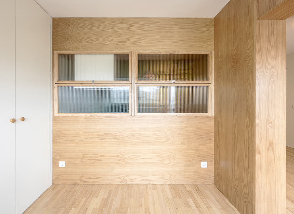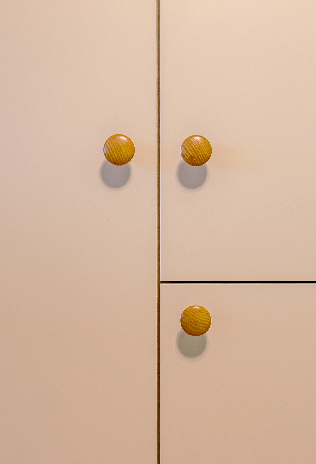 Um pequeno apartamento com flexibilidade de espaços e aproveitamento detalhado, com carpintarias de carvalho e tons pastel, que enchem a alma.