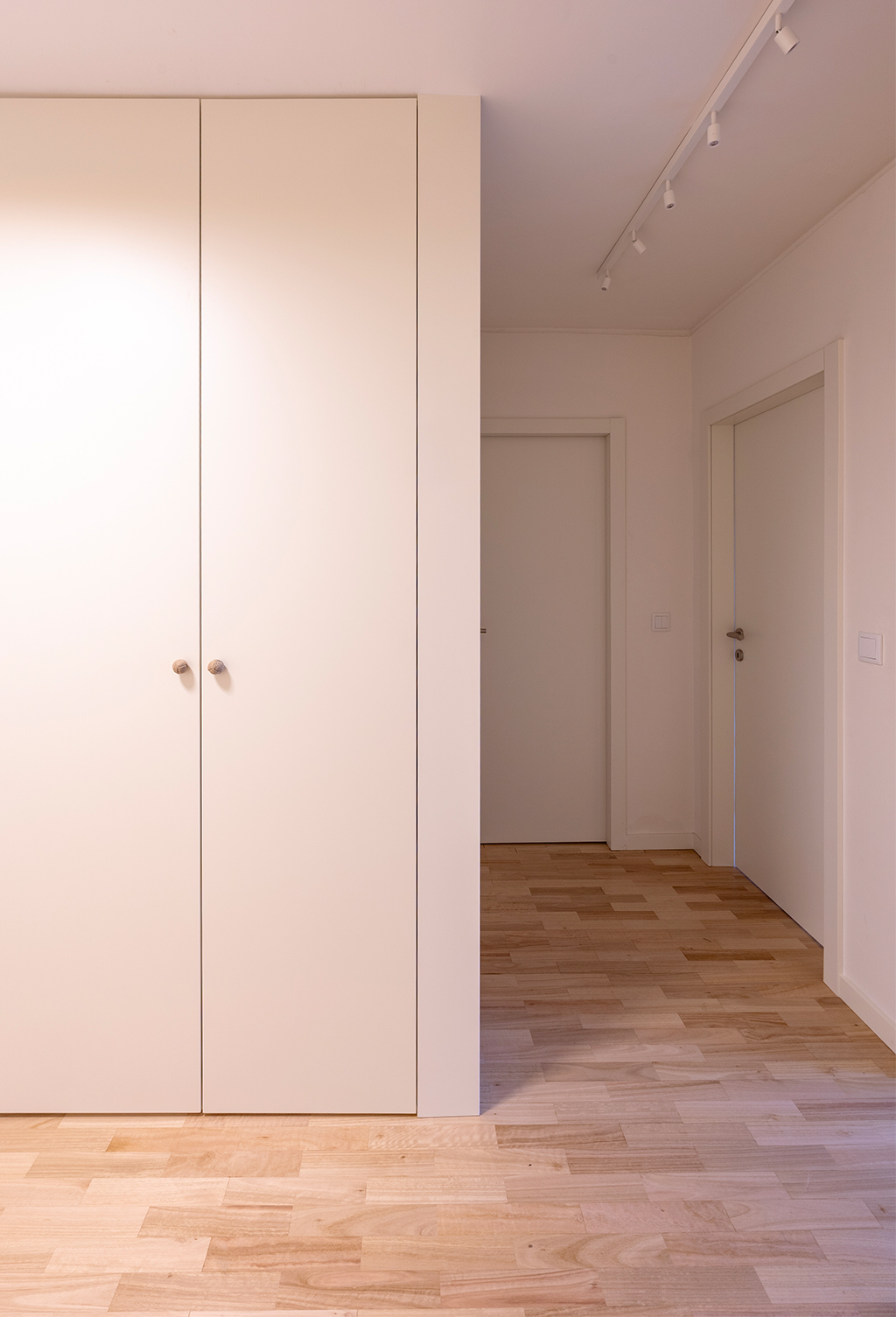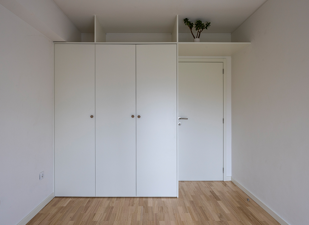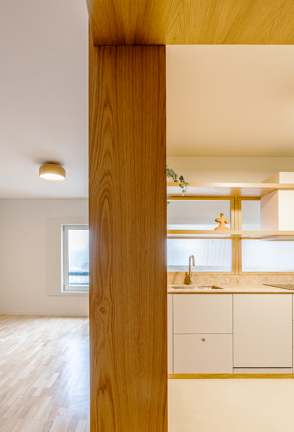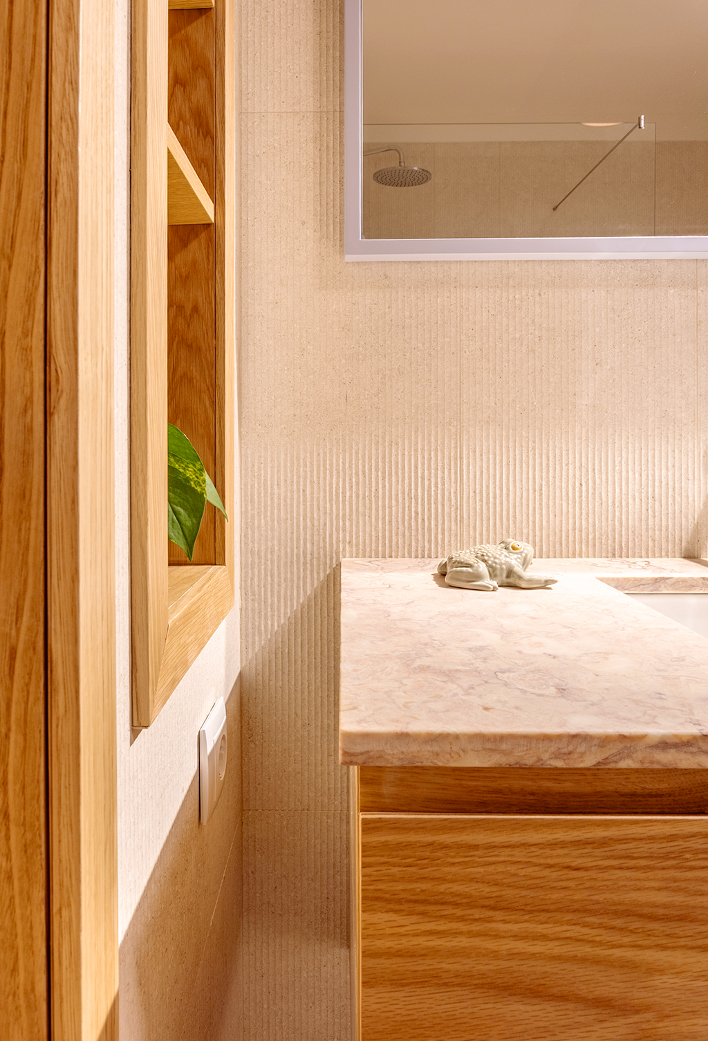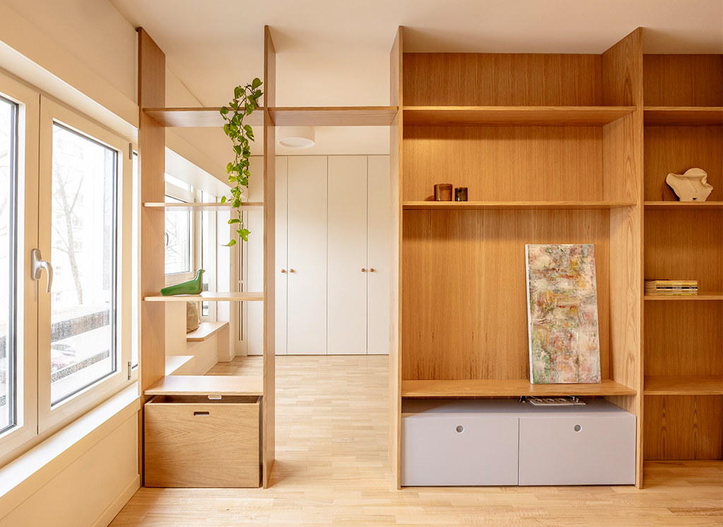 Um pequeno apartamento com flexibilidade de espaços e aproveitamento detalhado, com carpintarias de carvalho e tons pastel, que enchem a alma.