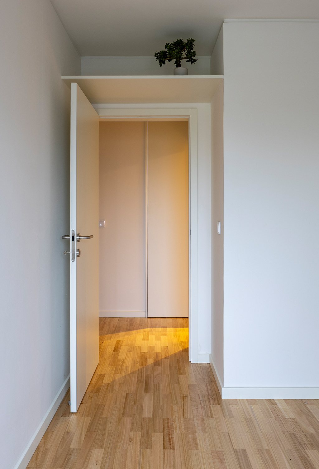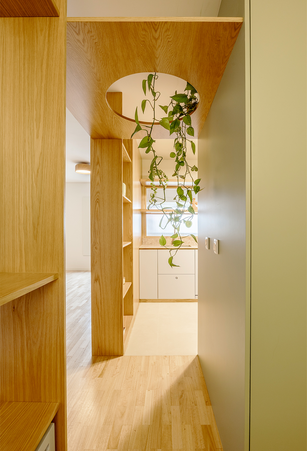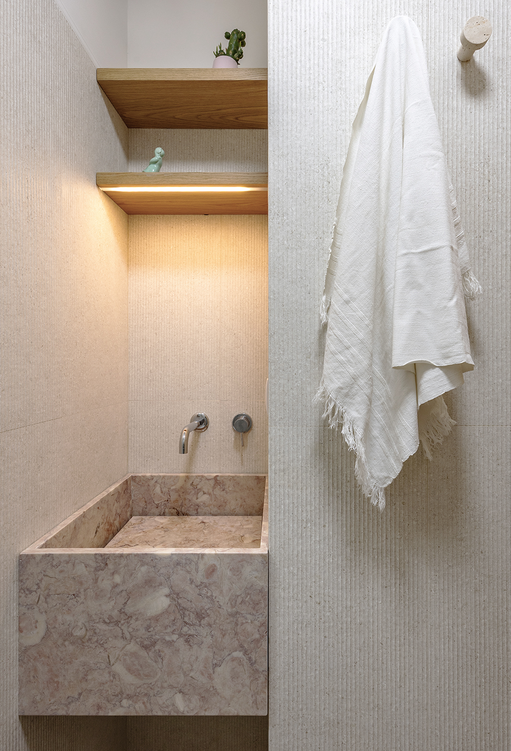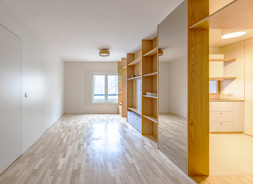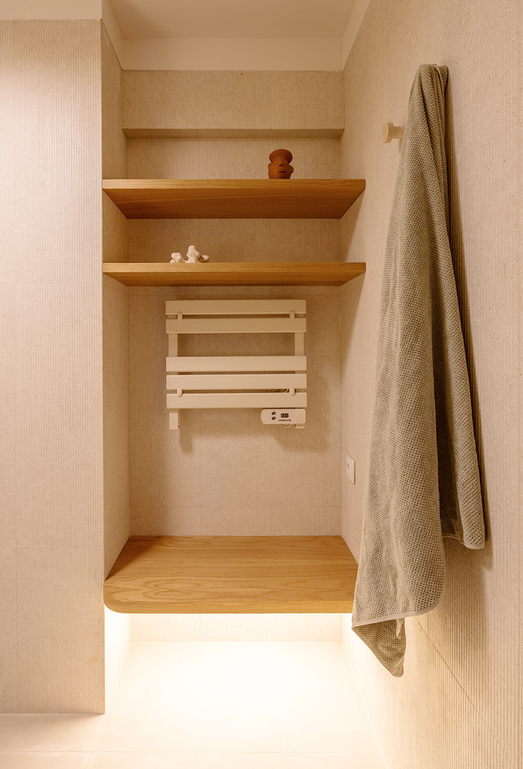 Um pequeno apartamento com flexibilidade de espaços e aproveitamento detalhado, com carpintarias de carvalho e tons pastel, que enchem a alma.